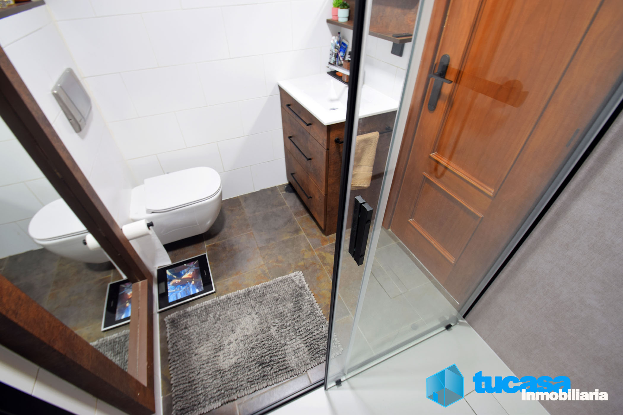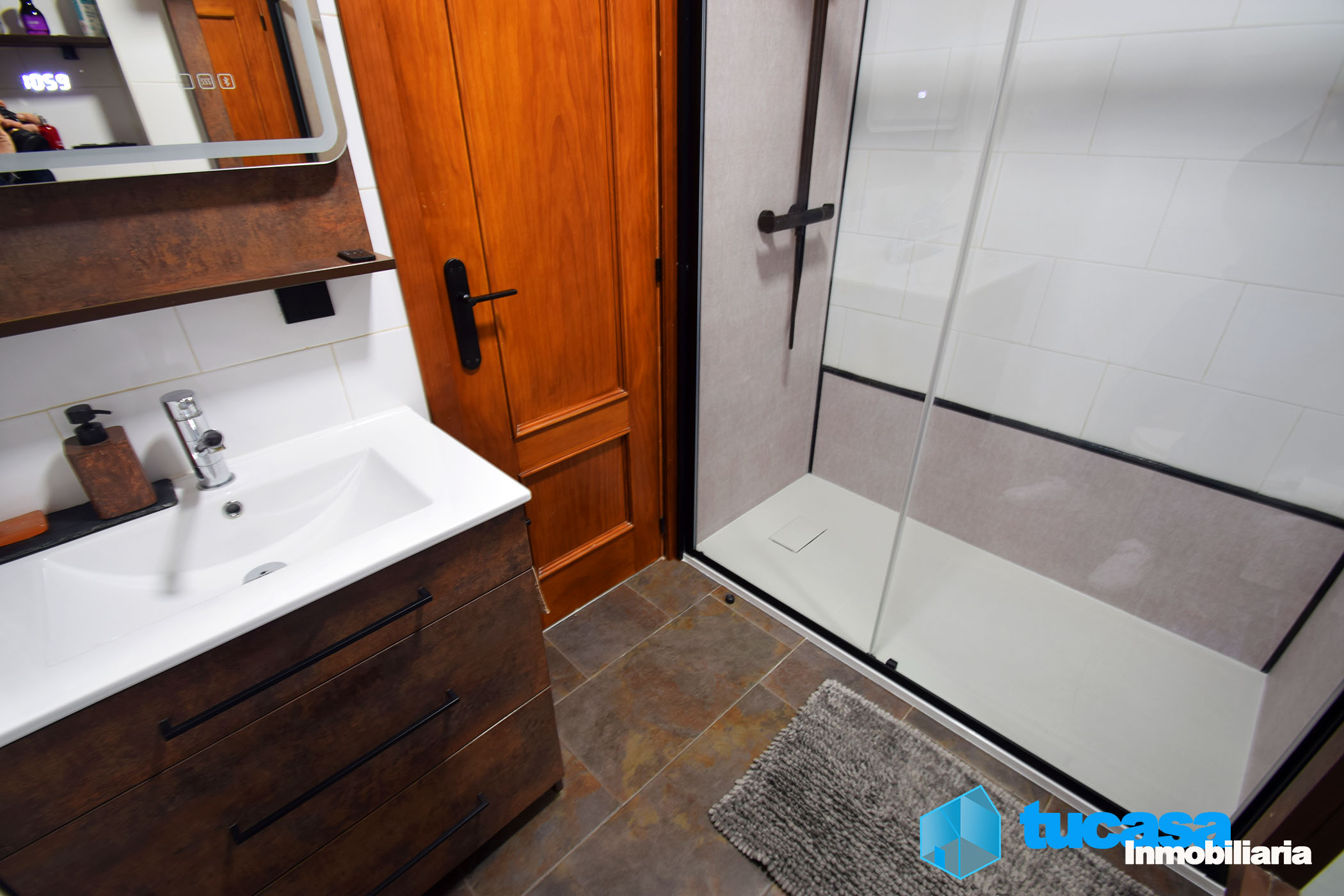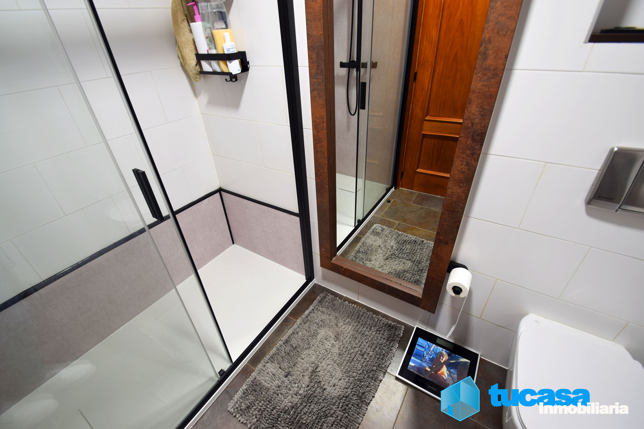 El baño es completo y moderno, equipado con un práctico plato de ducha y una amplia mampara. Cuenta con un mueble de baño de diseño, un elegante espejo táctil y un inodoro integrado en la pared, optimizando al máximo el espacio disponible.